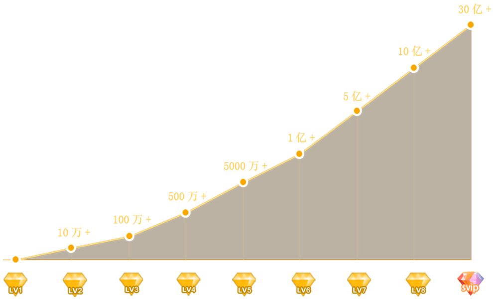 | 晋级标准 | - | 10W+ | 100W+ | 500W+ | 5000W+ | 1亿+ | 5亿+ | 10亿+ | 30亿+ |